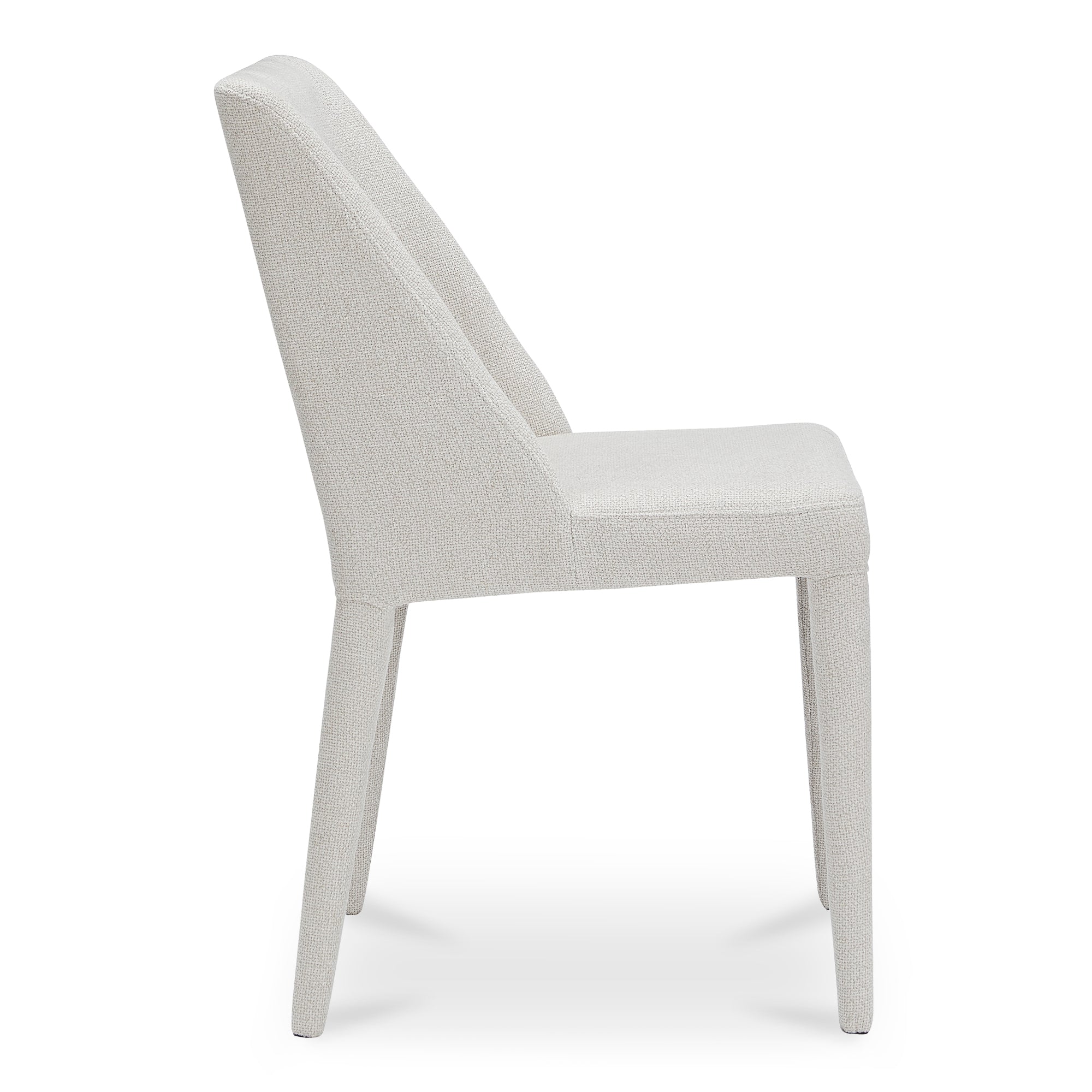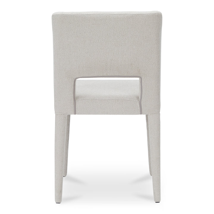 The Varekian Dining Chair in Beige by Nadaal Studios brings sculptural softness to the dining room. Fully upholstered with subtle curvature and carved detail, its backrest features a rectangular relief with softened edges for a light, elegant look. A slim iron frame supports high-density foam and durable polyester, making it as comfortable as it is sophisticated. Ideal for long dinners, this chair blends tactile comfort with refined design.