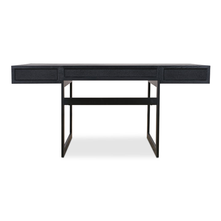Sleek, stylish, and sophisticated, the Nadaal Studios Vaughn Desk brings timeless Art Deco design into your workspace. Constructed with a solid oak frame in a refined black finish, this desk features vegan shagreen leather upholstery for a modern, textured touch. Brass-finished detailing and a sturdy base add a hint of elegance and durability. Equipped with three spacious drawers on smooth side-mounted glides, this desk offers ample storage to keep your workspace organized and clutter-free. Whether in a home office or bedroom, the Vaughn Desk combines functionality with a striking design that elevates any interior.