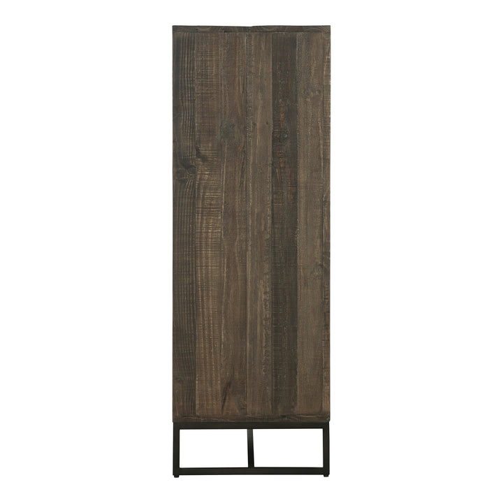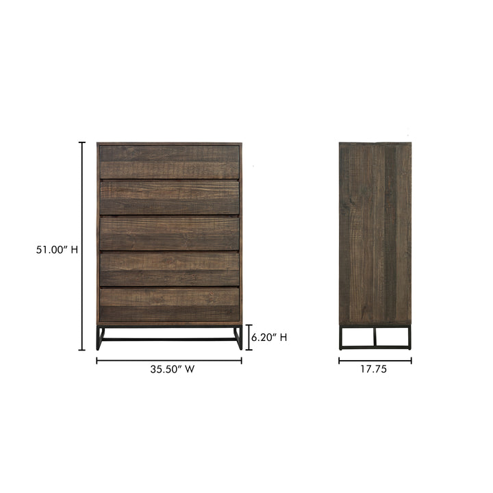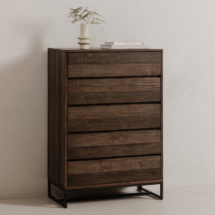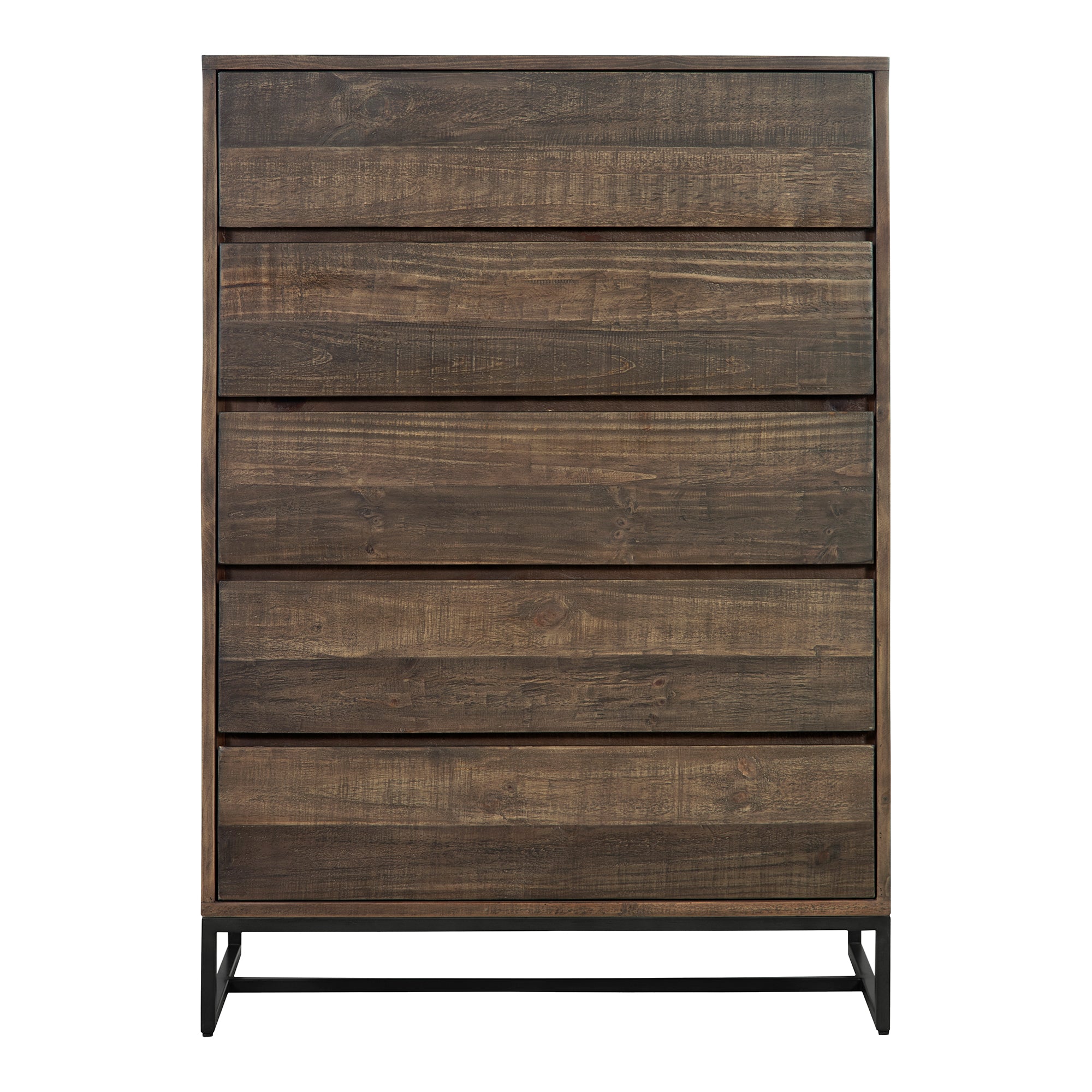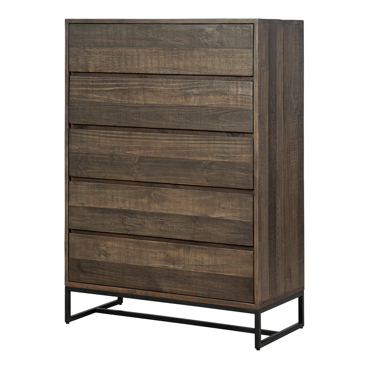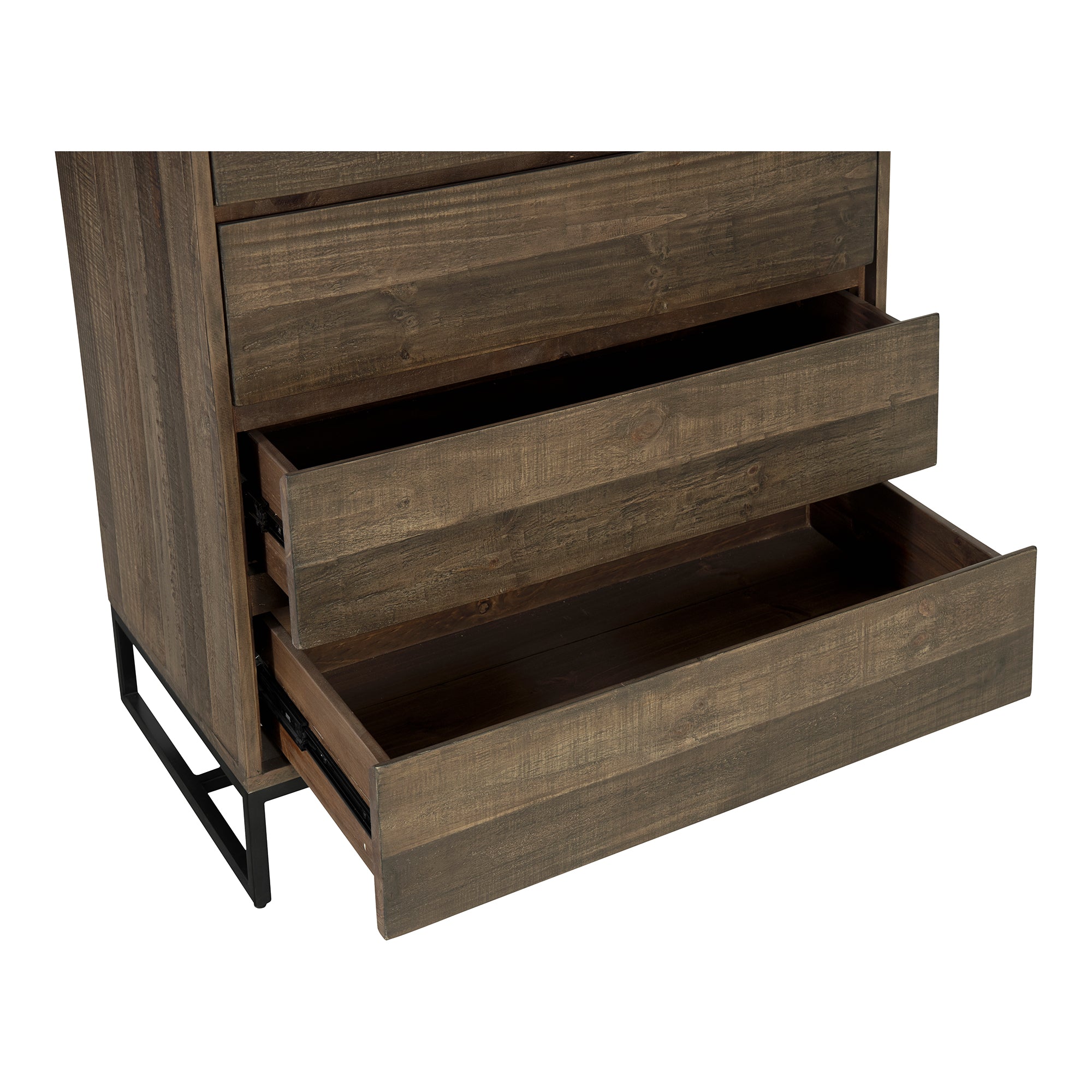 Vesper, Dresser, Rustic Solid Pine with Stainless Steel Base, 5 Drawers, Brown