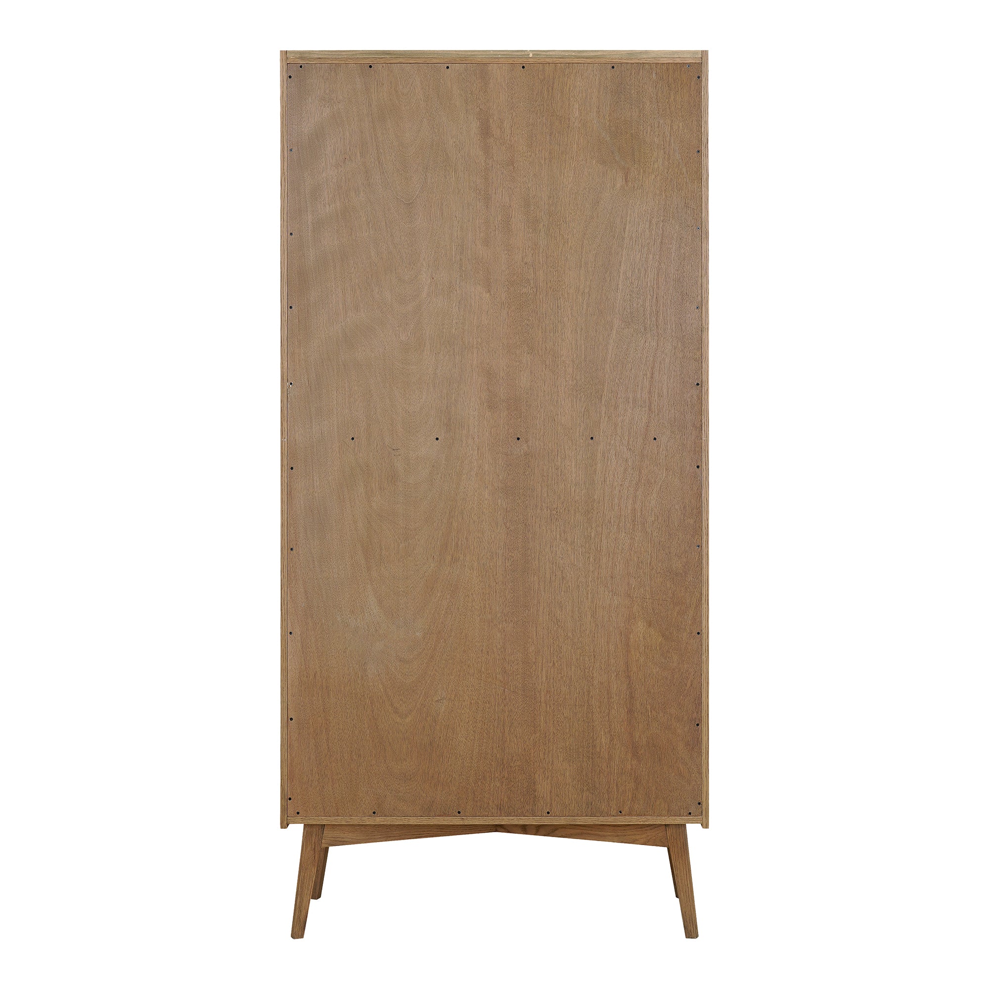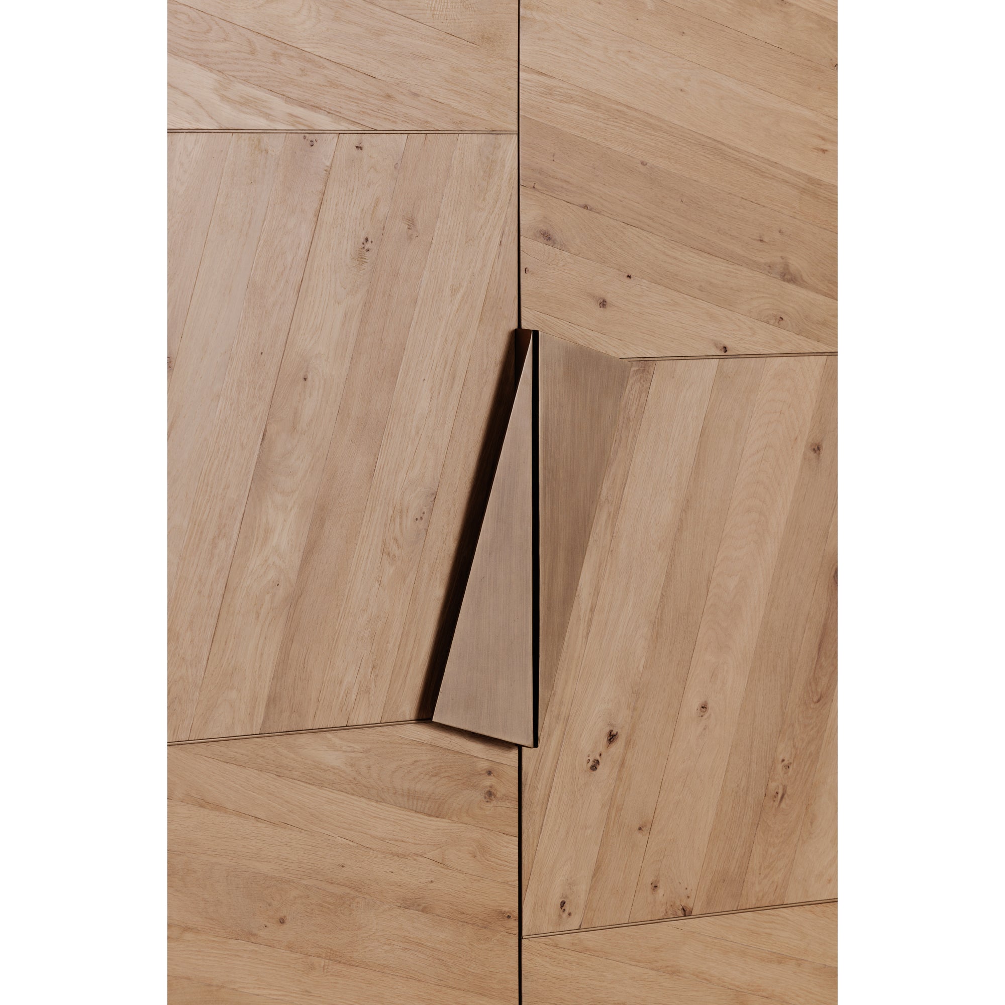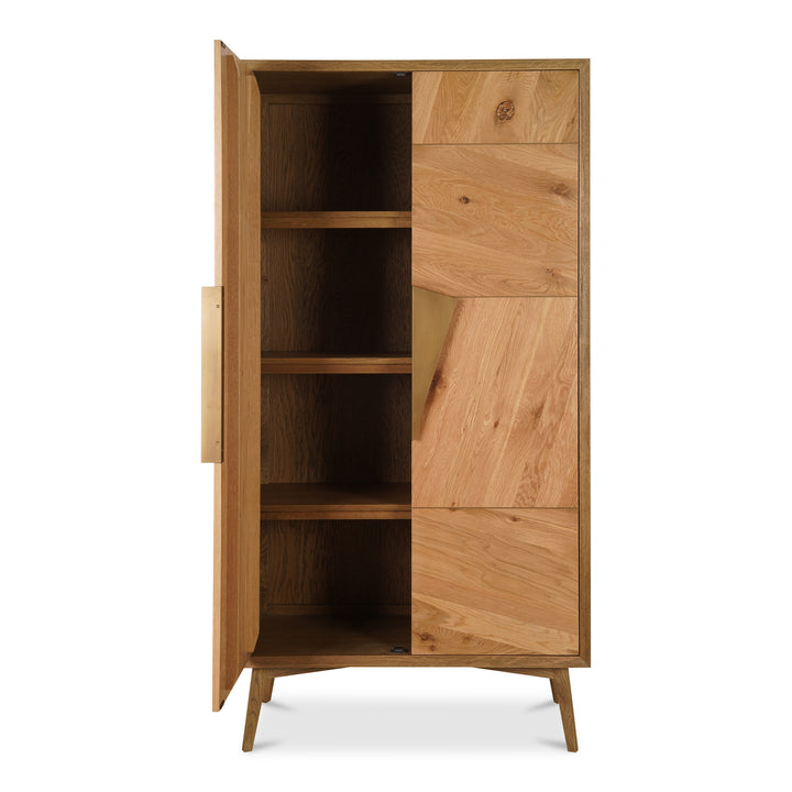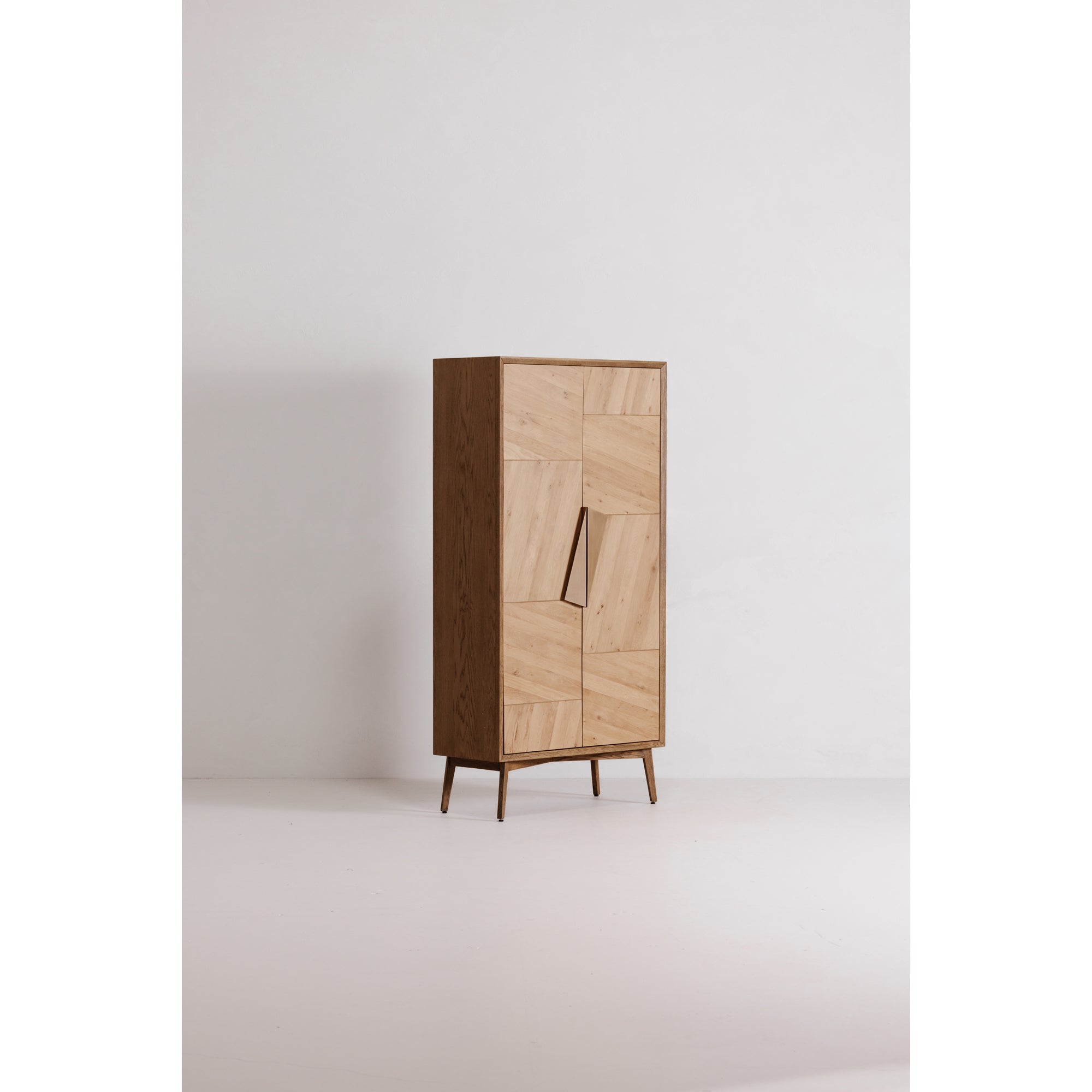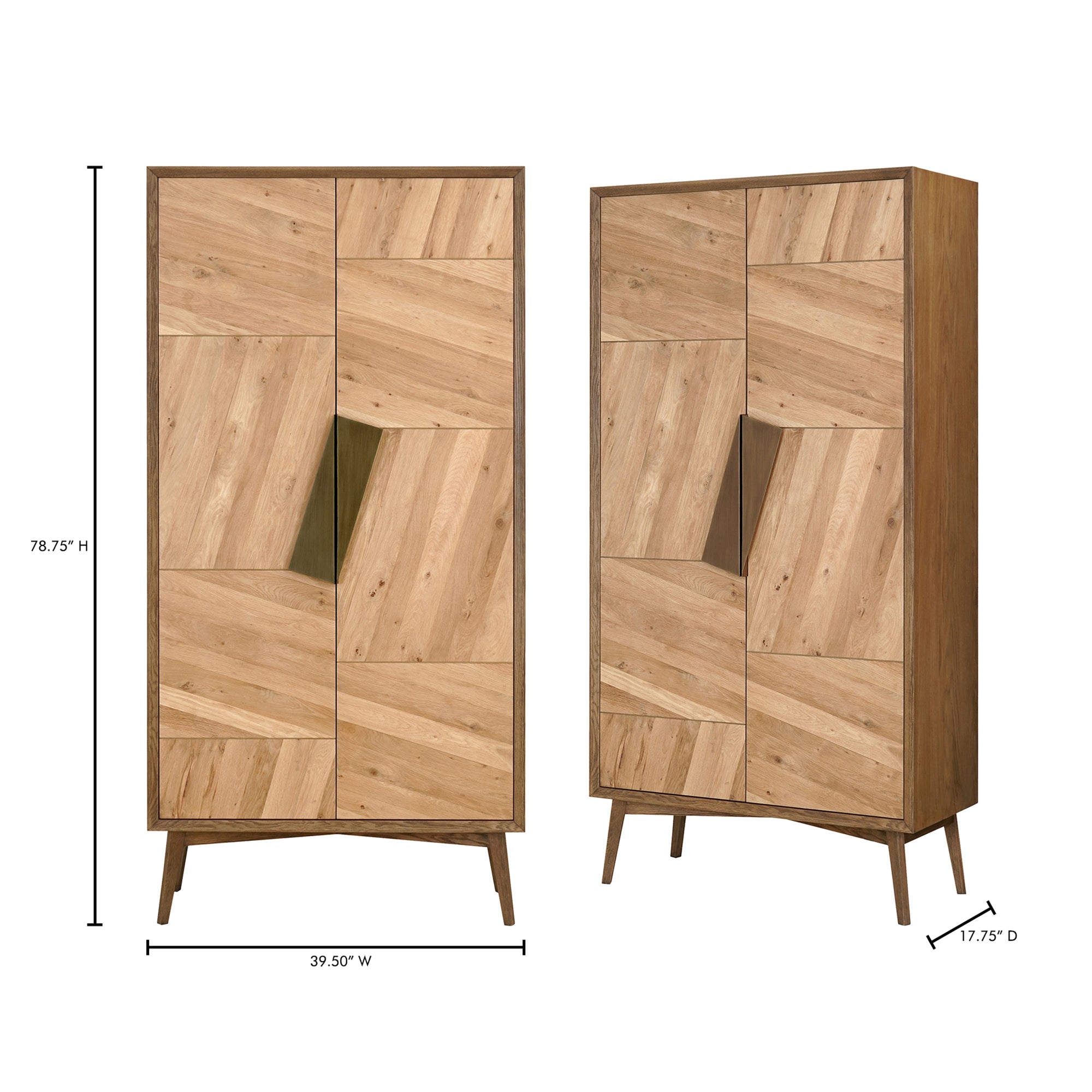 Introducing the NADAAL STUDIOS Vienne Tall Cabinet, where mid-century modern design meets natural elegance. This tall cabinet is expertly crafted from solid oak doors and legs, with an oak veneer over plywood cabinet, accented by sleek iron details. The two doors with magnetic catches open to reveal four spacious interior shelves, providing ample storage for your essentials, from linens to dinnerware. The Vienne Tall Cabinet’s geometric shapes and natural finish make it a stylish and functional addition to any room. The cabinet’s robust construction ensures it will remain a timeless piece in your home for years to come. Its high-quality materials and sophisticated design elevate your home, offering both beauty and practicality.
