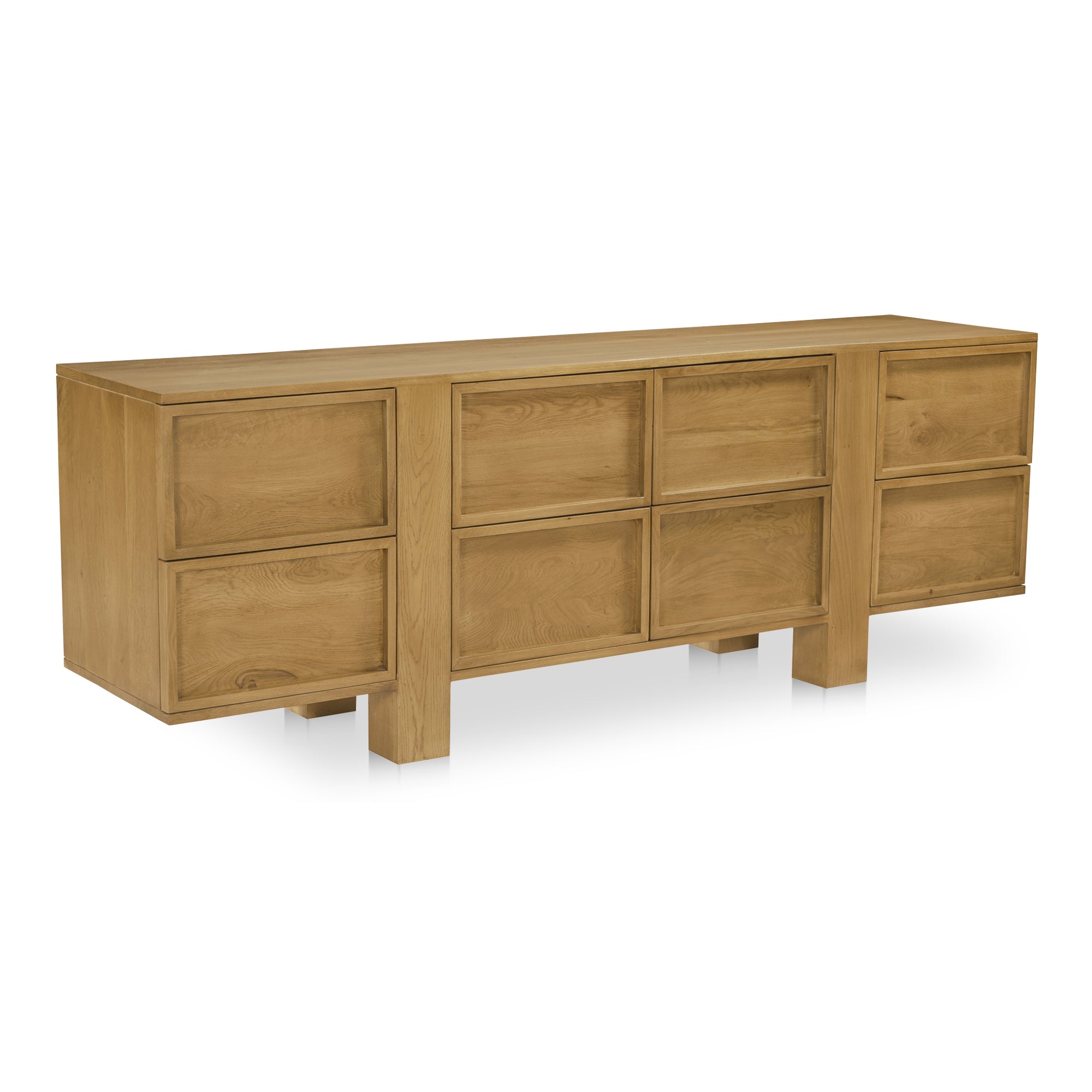 The Vionette Dresser in Brown offers graceful proportions, architectural lines, and thoughtful function. Crafted from solid oak with oak veneer interiors, the dresser features a linear silhouette anchored by elongated legs that lift the structure with subtle poise. What sets Vionette apart are the cleverly integrated side drawers—maintaining the integrity of the leg design while providing extra storage. With eight soft-close drawers on under-mounted glides and no assembly required, this dresser brings sophistication and simplicity into harmony.