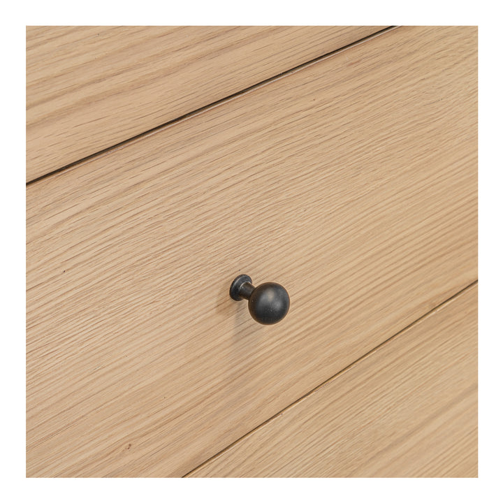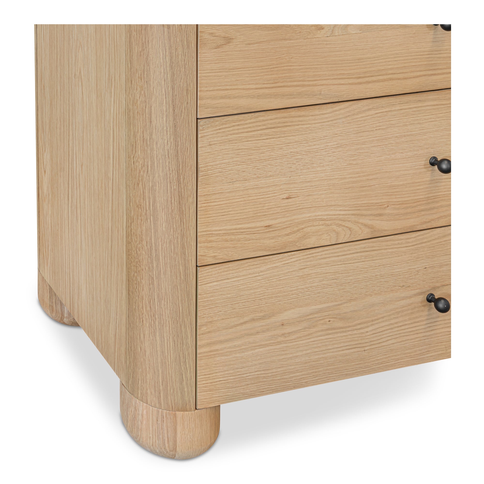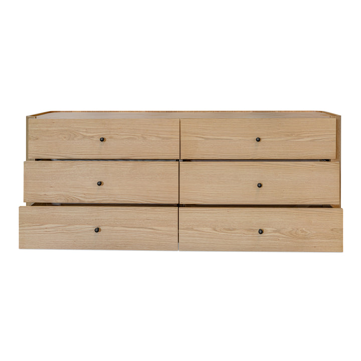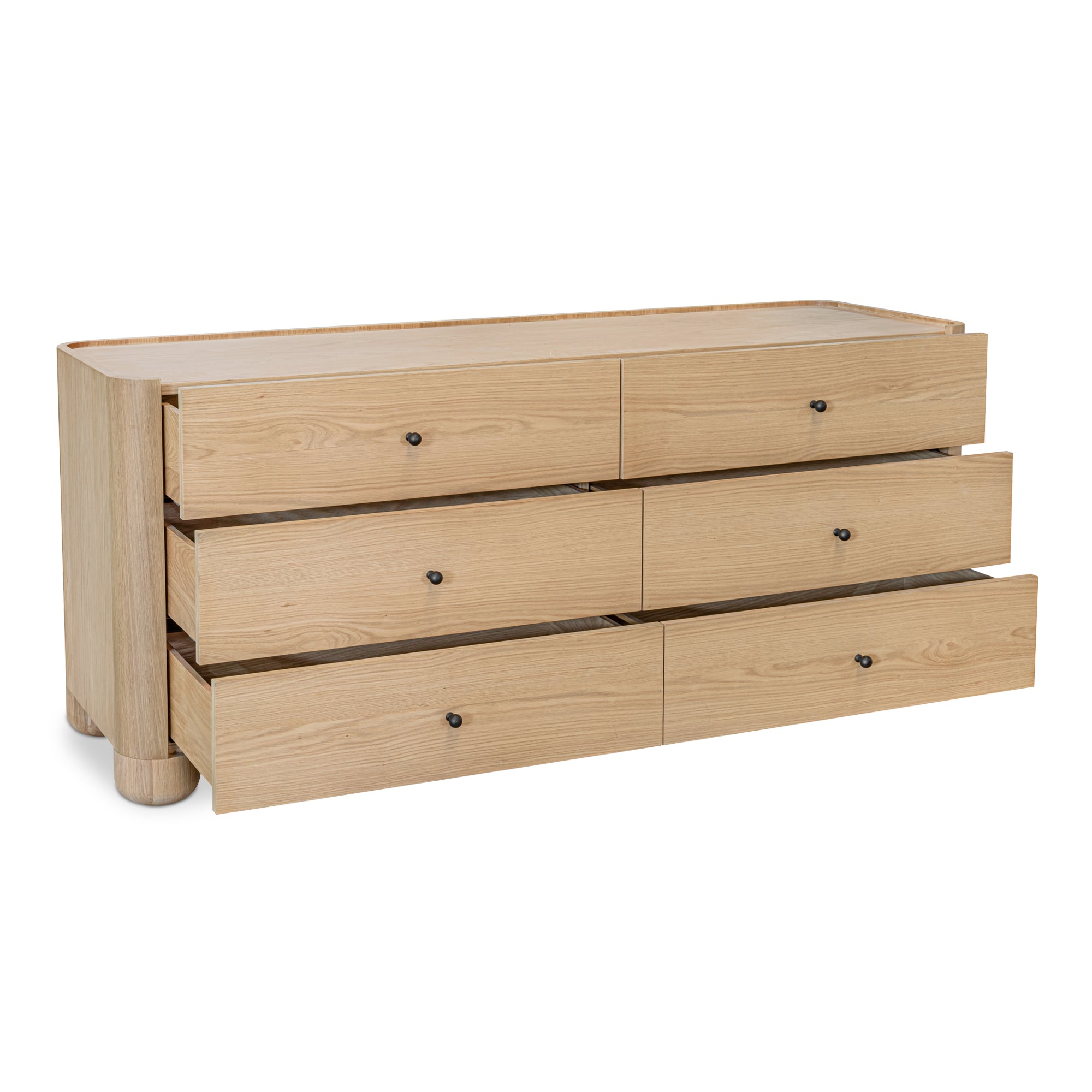Playful detailing meets classic form in the Virel Dresser in Natural. Designed with an integrated solid oak frame and legs, this piece features lip detailing along the top and side panels for a subtly sculptural look. The oak veneer drawer fronts, sides, and top bring a soft, organic touch, while the interior drawer boxes maintain structural integrity with oak veneer over MDF. Six drawers glide smoothly on under-mounted, soft-close tracks, offering ample room for storage. Virel’s clean lines and natural palette make it a timeless addition to modern or transitional bedrooms.