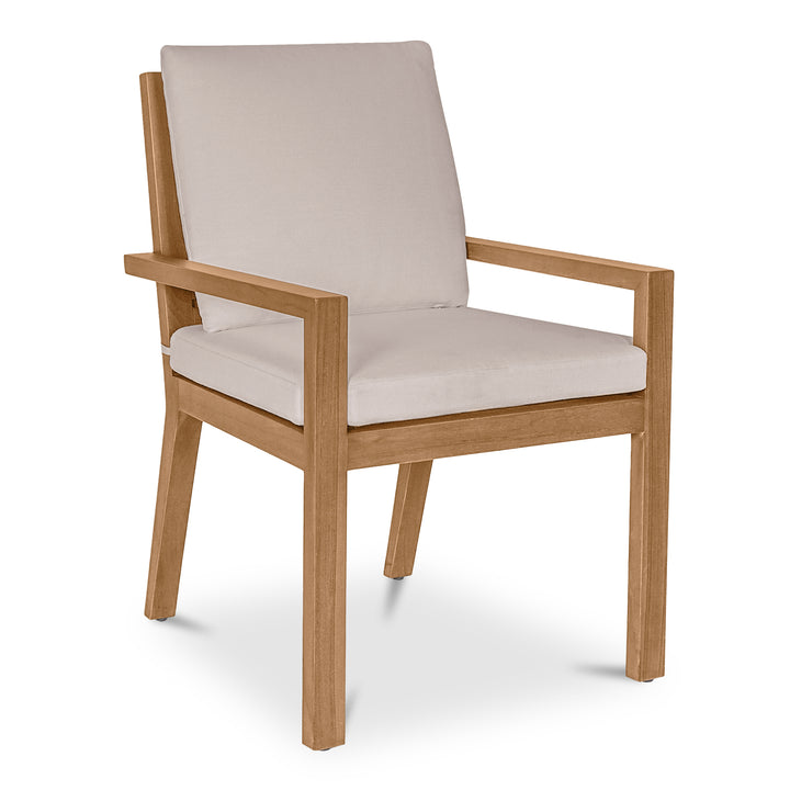 Designed to complement open-air settings, the Virelith Outdoor Dining Chair from Nadaal Studios is a foundational piece made for effortless lounging and clean-lined style. Crafted from solid teak with a slatted back and minimalist frame, it offers lasting structure and warmth. The quick dry foam seat is wrapped in 100% Olefin fabric for comfort in any climate, and secure cushion ties keep everything in place.