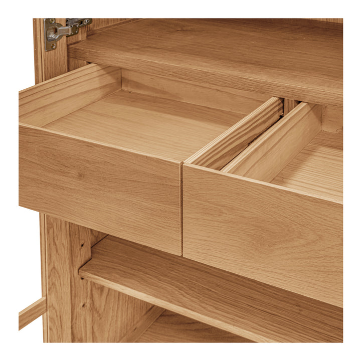 The Virelle cabinet reimagines classic storage through fine craftsmanship. A wire-brushed solid oak frame surrounds glass doors with elegant molding and overhang details, creating a timeless focal point. Oak veneer sides and top add smooth texture, while dual drawers and cable openings ensure modern functionality. Perfect for showcasing heirlooms or organizing media, Virelle brings structure, balance, and warmth to living and dining spaces alike.