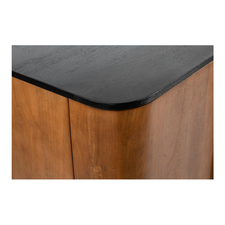 Add a touch of vintage charm to your home with the NADAAL STUDIOS Warwick Sideboard. This stunning piece is crafted from mid-tone brown mango wood, featuring a dark brown matt finish that highlights the wood's natural grain. The metal legs and handles with statement brass accents enhance its antique look, while the soft, curved door design adds a gentle touch. The Warwick Sideboard offers ample storage space behind its four doors, making it a practical and stylish addition to any dining or living area.