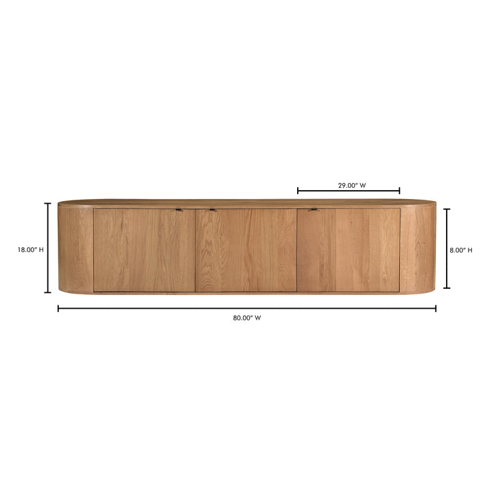 Yasmin Media Console, 3-Door Solid Oak with Curved Oval Shape and Interior Shelving, Scandinavian Design, Natural Finish