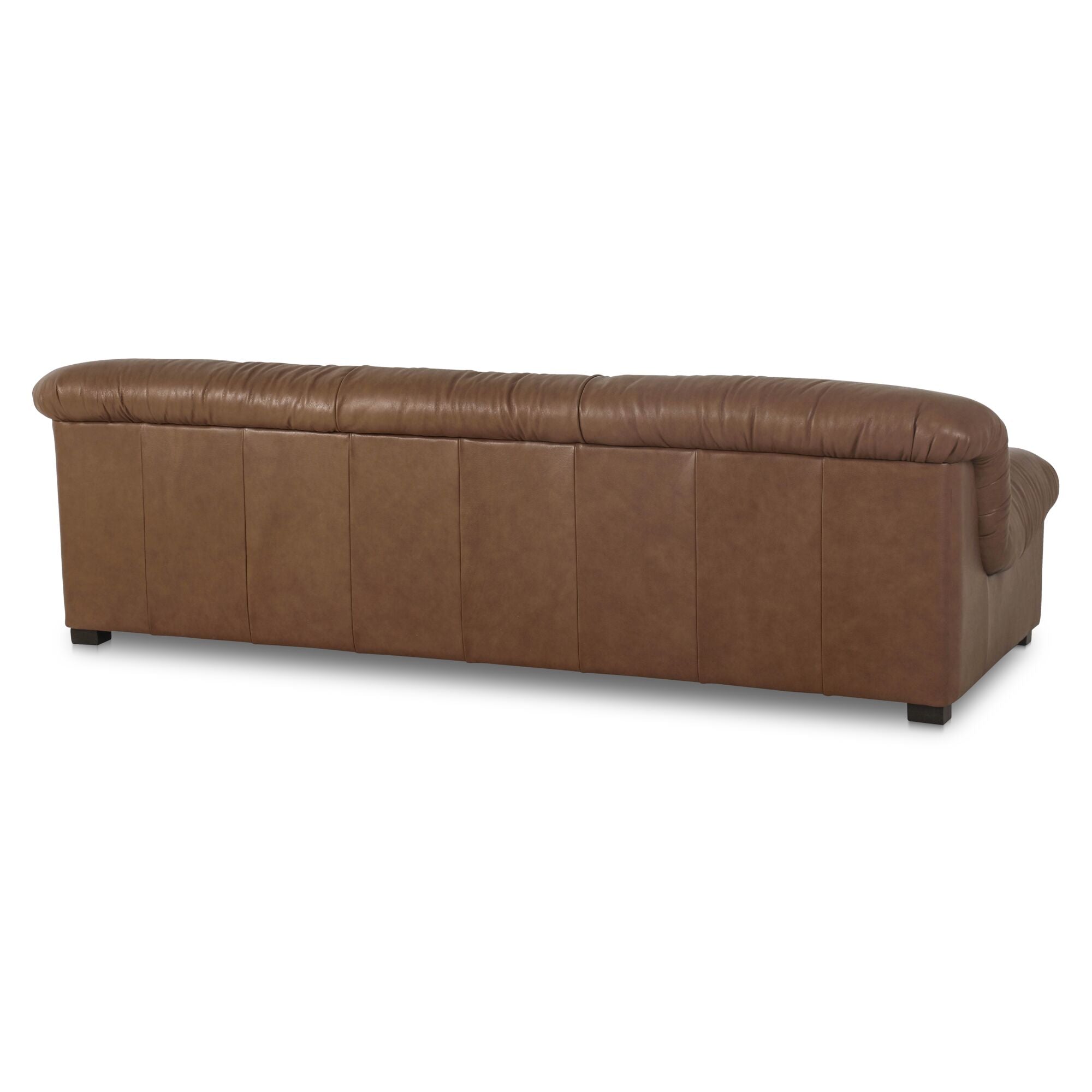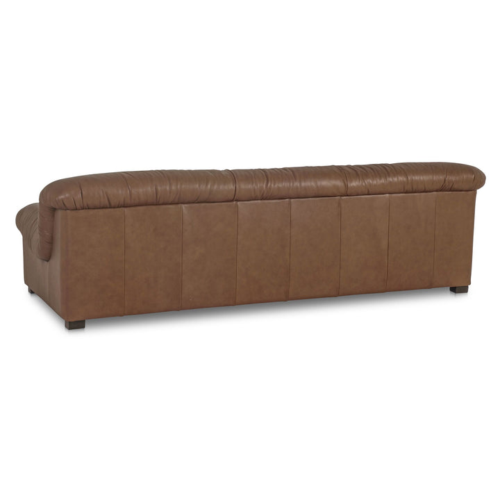 Zarek scales the signature gathered look into a generous three-seat sofa for everyday lounging. Upholstered in 100% top grain leather that softens and patinas, it pairs plush feather, fiber, and foam cushions with supportive spring suspension. A solid pine and plywood frame grounds the expansive silhouette, bringing relaxed luxury to modern living rooms. The warm tan finish layers seamlessly with woods, metals, and textiles, creating a timeless anchor that evolves beautifully with your space.